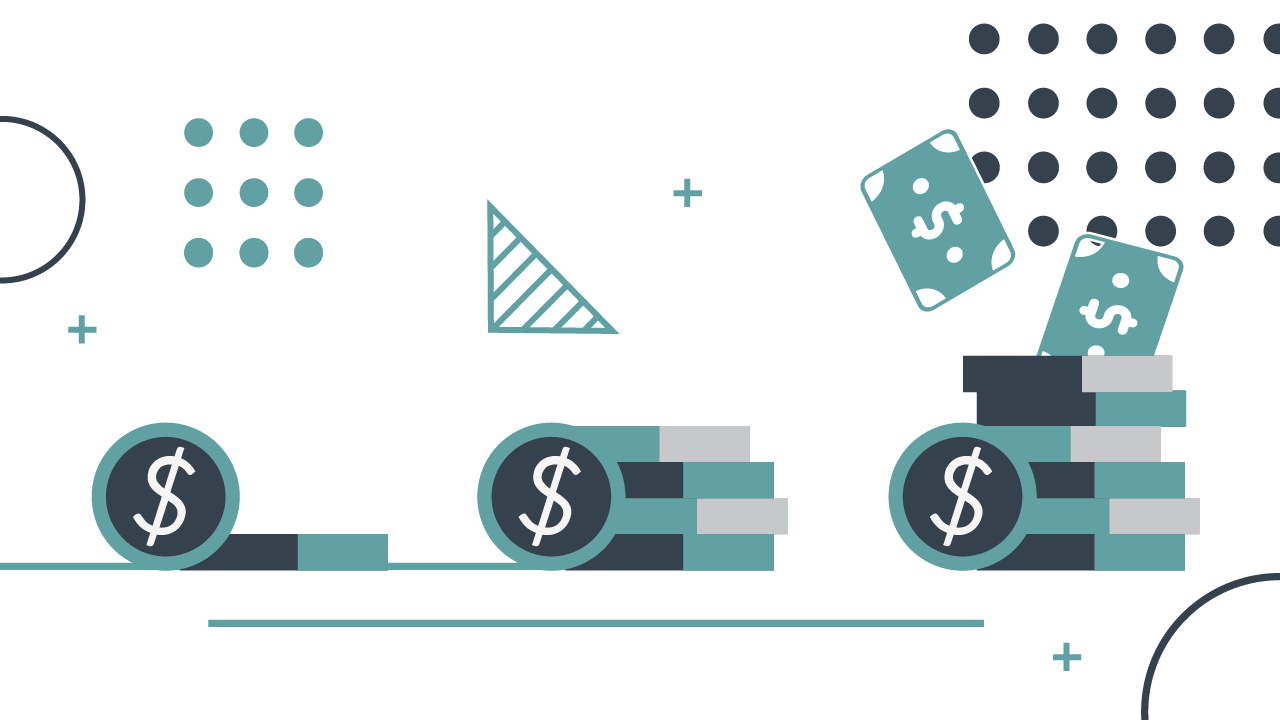 A modern, minimalist illustration depicts the concept of college investment and potential return. On the left, a single stylized coin with a dollar sign represents an initial investment, leading to a small stack of coins and horizontal bars, symbolizing early costs. Progressing to the right, a larger, growing pile of dollar coins and stacked horizontal bars signifies increasing expenses or accumulating funds over time, directly correlating with the