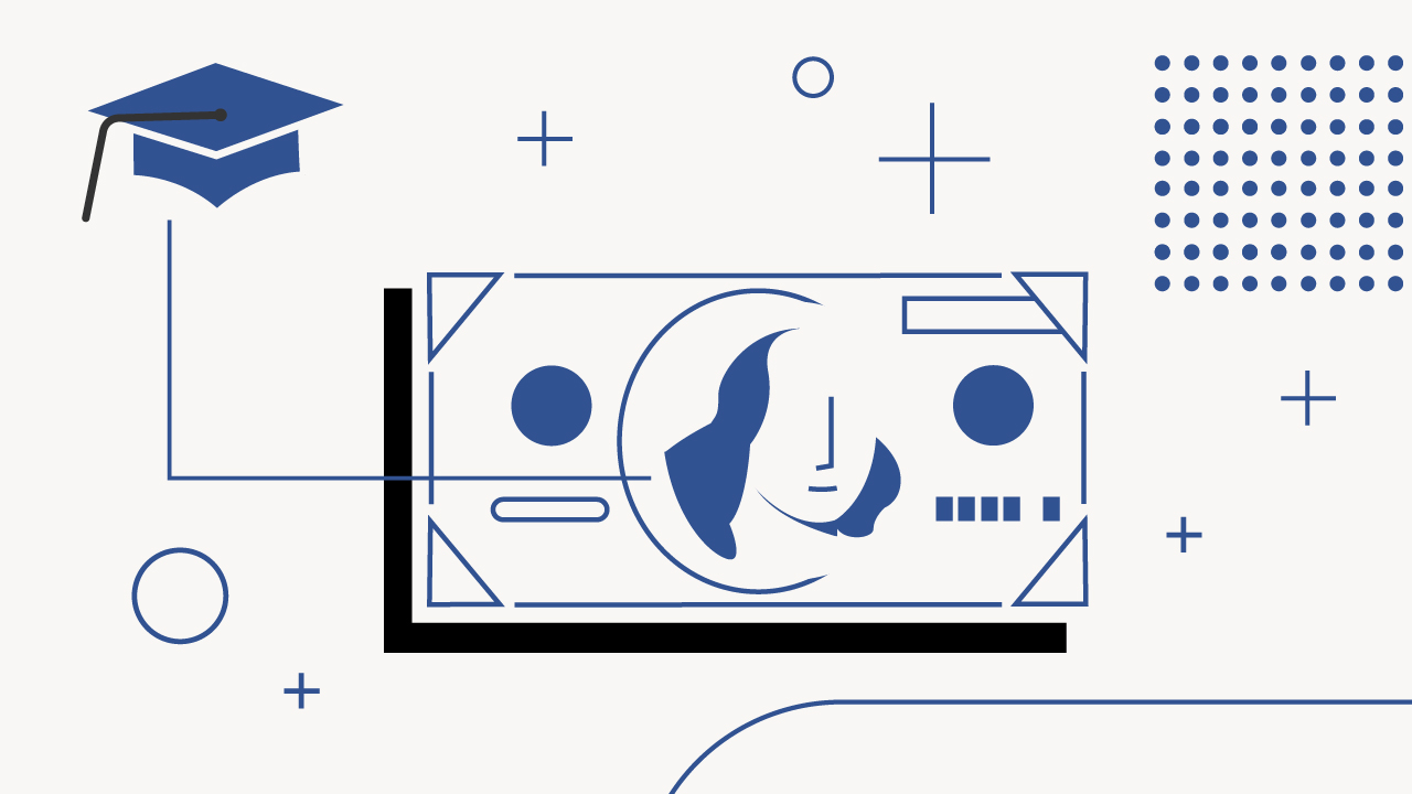 A graphic illustration comparing US and UK student loans, featuring a blue graduation cap with a tassel on the upper left, connected by a thin line to a stylized blue and black dollar bill with a profile of a person's head and the word "DOLLAR" partially visible, indicating the financial aspect of education. The background is a light gray with various geometric shapes in blue and black, including circles, plus signs, and a pattern of dots, alluding to the complexities and different systems of student loan borrowing limits, tuition fees, and maintenance loans discussed in the article. This visual metaphor highlights the comparison of student loan systems and costs between the United Kingdom and the United States, particularly emphasizing tuition fee loans and maintenance loans, and how they differ in covering tuition and living expenses.
